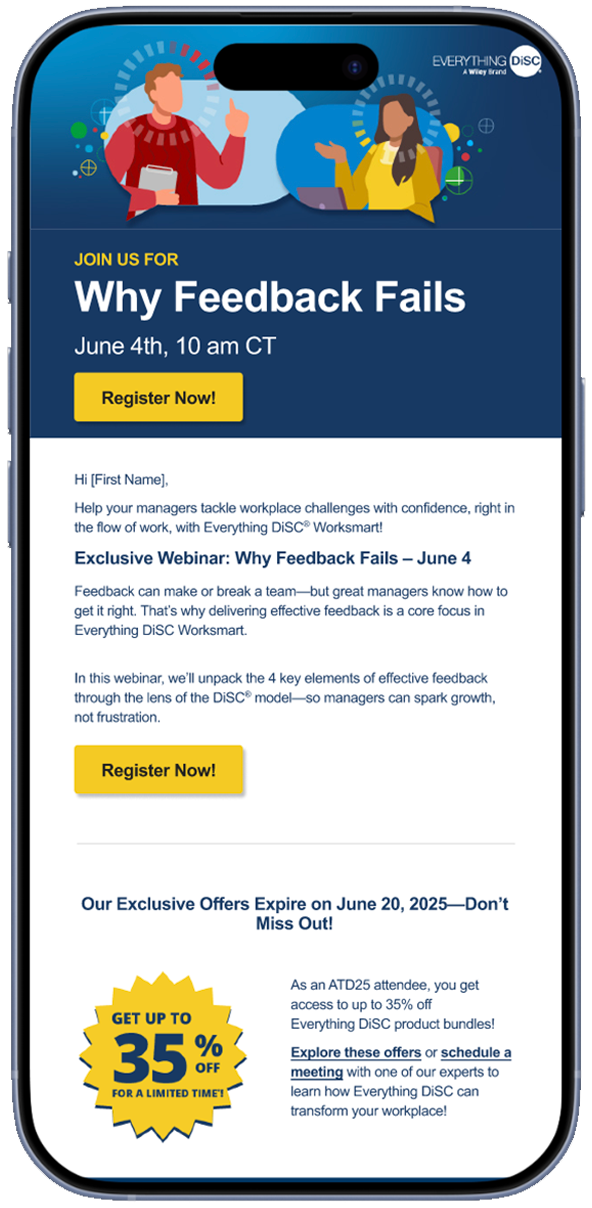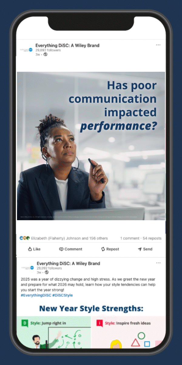 This page highlights my work for the Everything DiSC brand—from helping to define its visual identity and tone, to designing marketing materials and social media content that bring the brand to life. My work centers around the communication with our partners and would be clients. I create eye catching illustrations and designs that pull the viewer in to learn more about the offerings of the company—which in turn leads to more sharing on social media and increased revenue through engagement with new clients and partners.