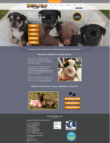 The Motley Zoo is an Animal Rescue with a brand centered around a pun about the rock band The Motley Crew and this influence is heavily reflected in its branding and website design. The goal of the site is to bring people into its community and have them engage with the organization through donation, adoption or fostering.