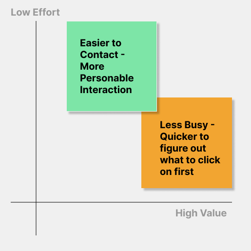 Using a 2x2 prioritization matrix, I made it clear that the top items that our users wish for is to make the site easier to use and more personable. How do we do that? First I aim to tackle the usability of the navigation and make the path clear for users to understand where to start. For this step I looked to add other navigation items to the home page in order to give people more context to their decisions (like adoption or fostering).