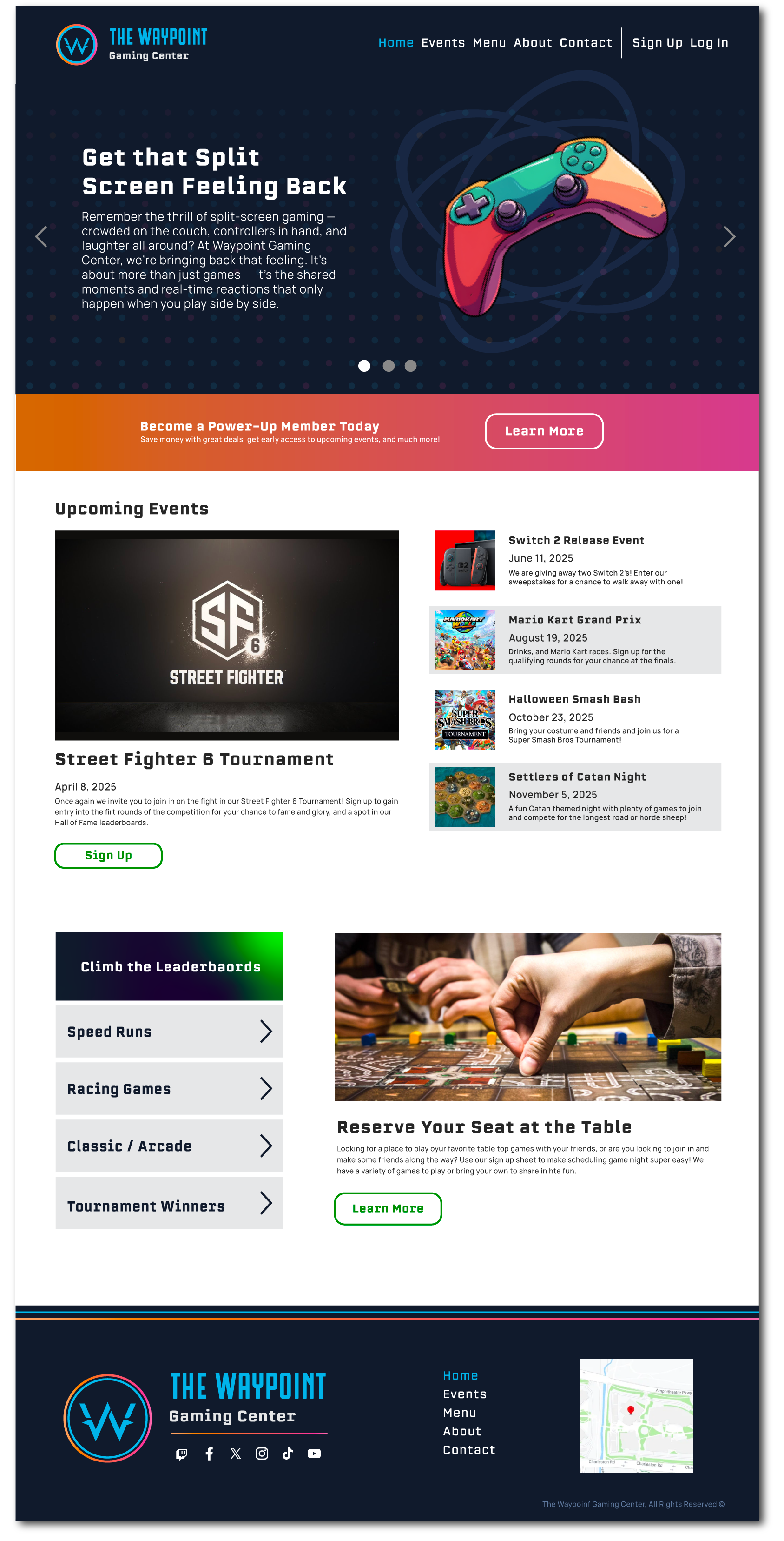 Every element—from the color scheme to the interactive features—was crafted to feel immersive, modern, and gamer-friendly, creating a digital experience that mirrors the excitement of being at Waypoint in person.